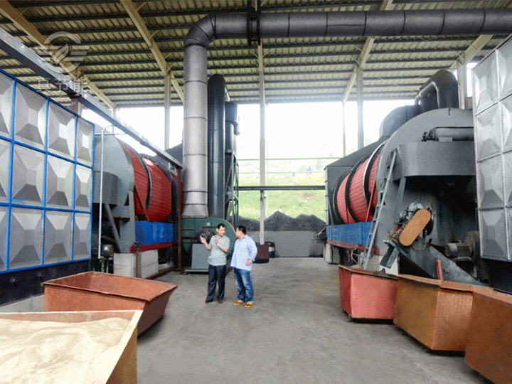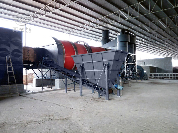 其工藝流程:熱風(fēng)爐是產(chǎn)生熱能的場(chǎng)所。將燃料加入熱風(fēng)爐中,通過燃燒產(chǎn)生高溫?zé)峤橘|(zhì),為烘干機(jī)主體提供連續(xù)穩(wěn)定的熱量。然后再由上料裝置(皮帶運(yùn)輸機(jī)、密封刮板輸送機(jī)或螺旋輸送機(jī))均勻連續(xù)的將物料送入烘干機(jī)內(nèi)部。物料與高溫?zé)峤橘|(zhì)在筒體內(nèi)部進(jìn)行熱交換,從而將物料中的水分蒸發(fā)出來(lái),實(shí)現(xiàn)物料從高濕高粘轉(zhuǎn)變?yōu)椴粷癫徽场__(dá)到烘干要求的物料,經(jīng)過出料裝置運(yùn)送出來(lái)進(jìn)行統(tǒng)一打包、裝載。而在烘干過程中產(chǎn)生的煙氣、粉塵等氣體,通過引風(fēng)機(jī)將其輸送至除塵設(shè)備當(dāng)中進(jìn)行凈化、過濾、降塵,實(shí)現(xiàn)氣體的達(dá)標(biāo)排放。整個(gè)烘干生產(chǎn)線一體化聯(lián)動(dòng),共同完成物料的烘干。